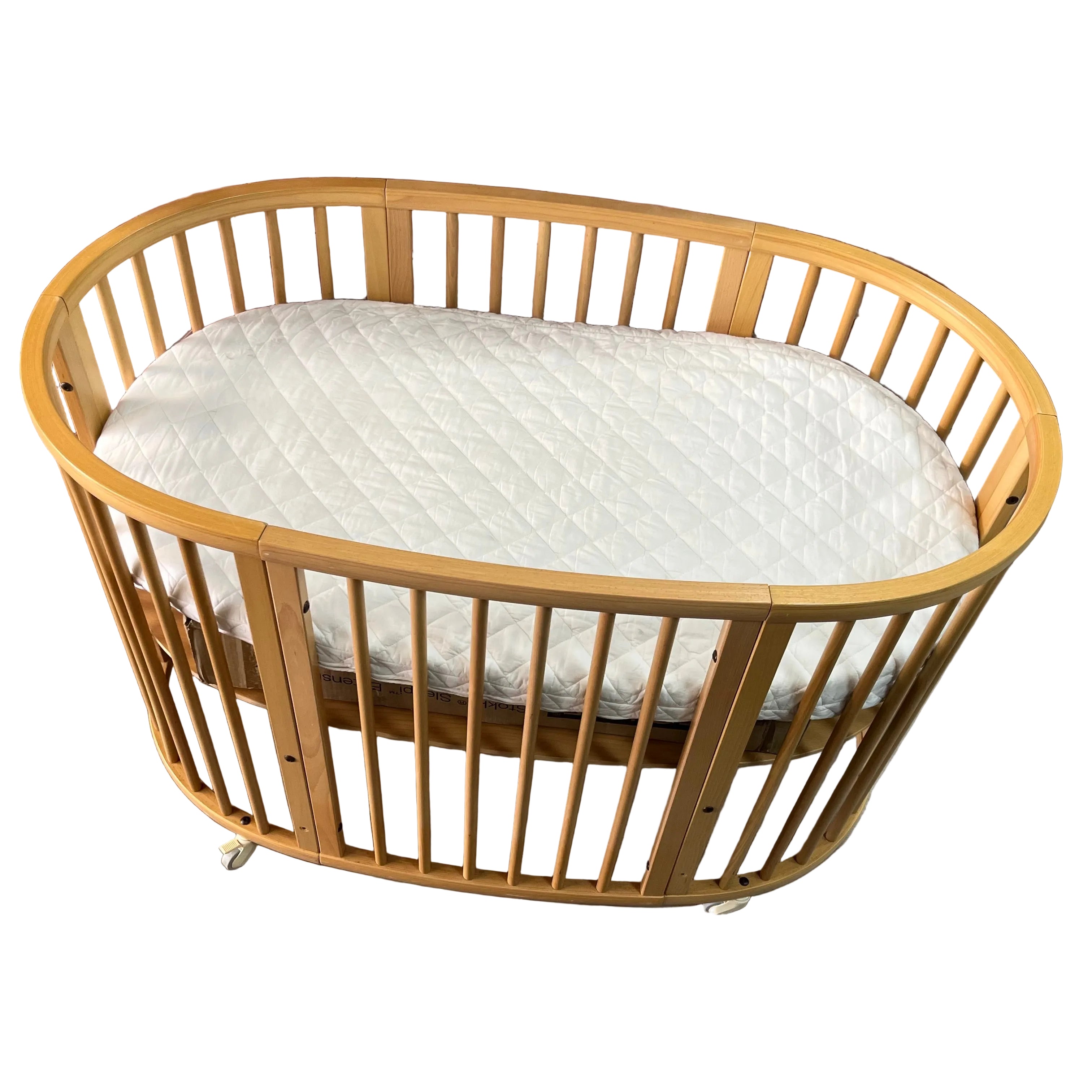 The Stokke Sleepi V2 Natural Cot is a versatile, oval-shaped baby bed designed to grow with a child from newborn up to around age 10, featuring lockable wheels, height-adjustable mattress support for airflow, and conversion kits to transform from a Mini bassinet to a full cot and then a toddler bed, all in a classic, natural wood finish for a cozy, nest-like feel.